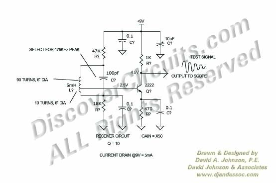 This circuit is discussed in more detail in the Experimenters Journal. The receiver’s six inch diameter coil detects the ring signal from the above transmitter and use a single NPN transistor to provided enough Amplification for the signal to be easily viewed on an oscilloscope.