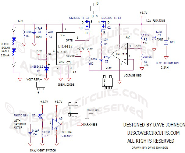 the battery, the output turns on the p-channel device Q1. In darkness, when the solar