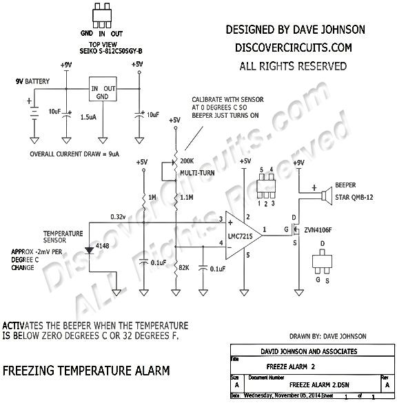 other side. When the temperature is below freezing, the voltage at the non-inverting (+) input exceeds the