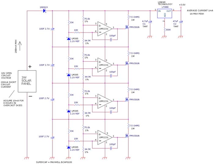 The solutions was in incorporate some supercapacitors. The four capacitors, would be charged with the current from a solar panel. The supercapacitors would be regulated with a voltage limiting circuit.