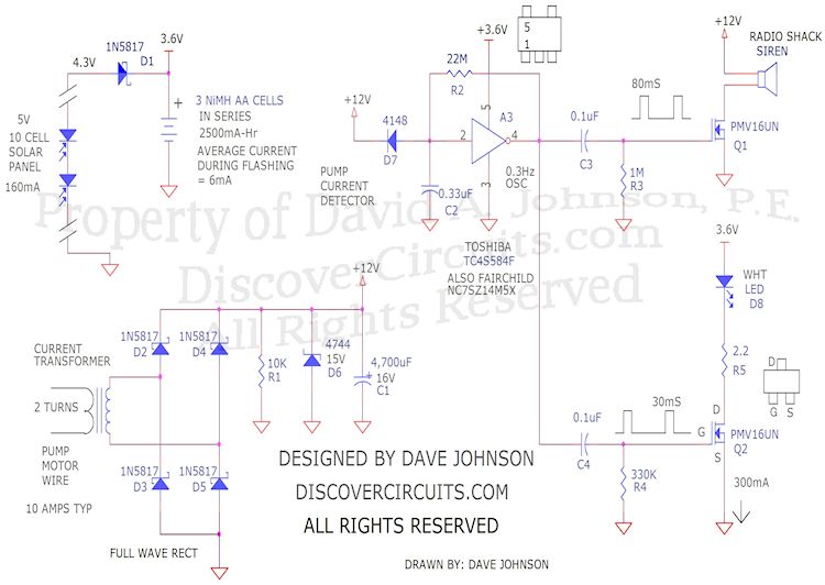 A signal diode D7 becomes reversed biased whenever the pump motor is in operation. This allows a Schmitt trigger 0.3Hz oscillator to begin oscillating. The square wave output of the oscillator is split into two paths. One path is connected to an n-channel FET, which drives the siren with a short 80ms pulse. The second path is connected a second FET circuit, which flashes the bright white LED with 30ms pulses. R5 limits the LED current to about 300ma peak.