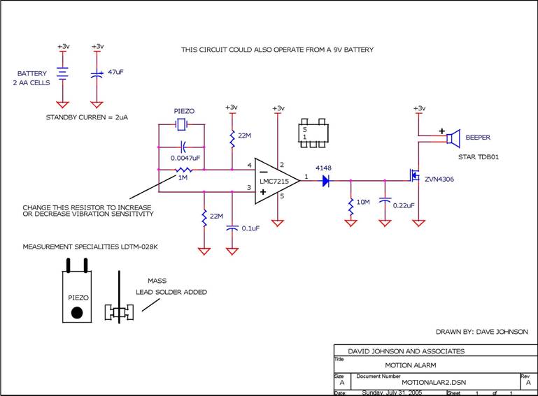 An inexpensive piezoelectric device is used as a motion sensing device for this motion alarm.