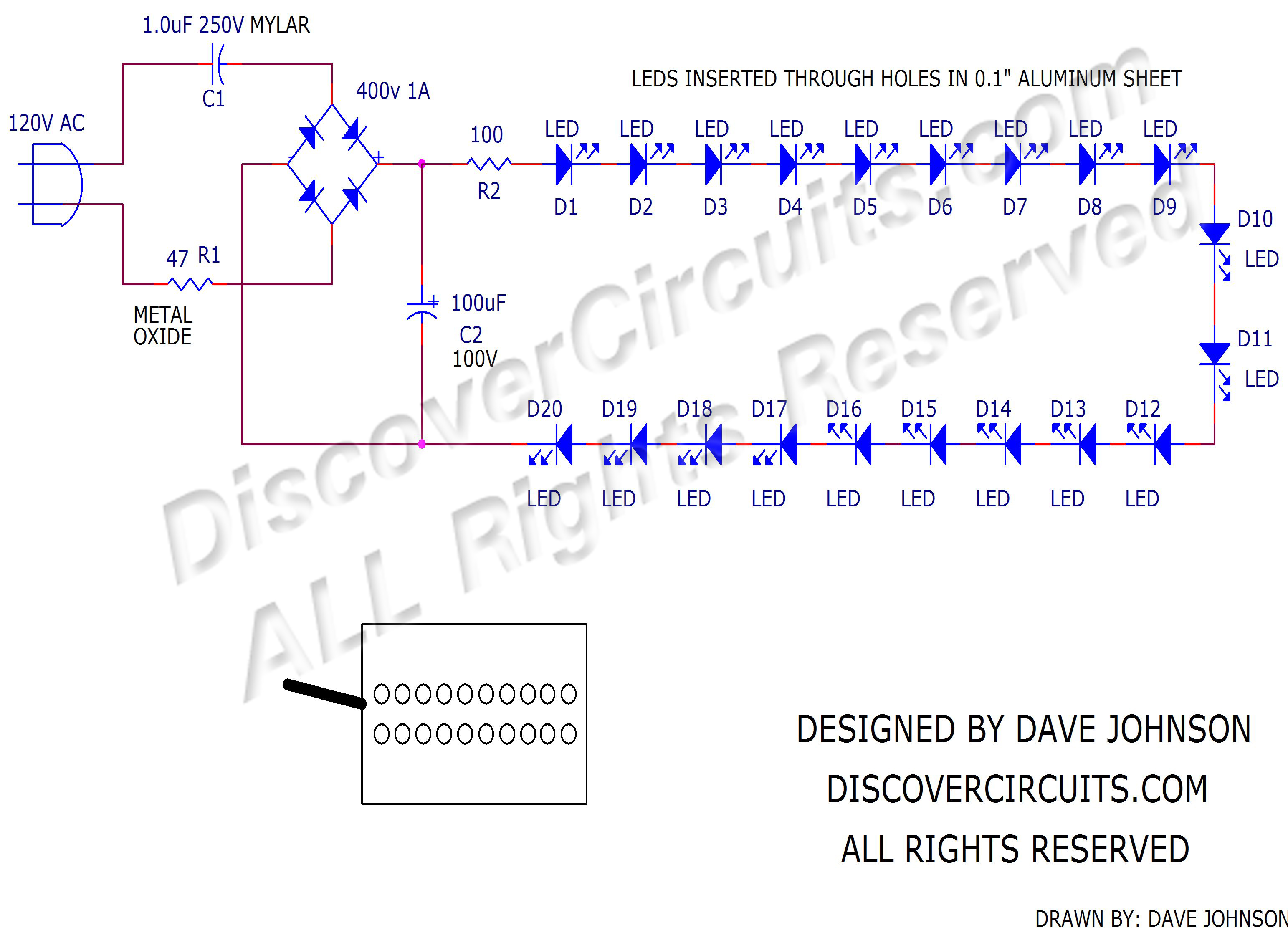 The standard T 1 ¾ style LEDs were all wired in series. A 1.0uF capacitance voltage dropper type circuit was used to generate about 60 volts DC to drive the LEDs with about 20ma of current. R2 serves as a current limiting device during initial activation of the light. A metal oxide resistor R1 acts as a fuse. |