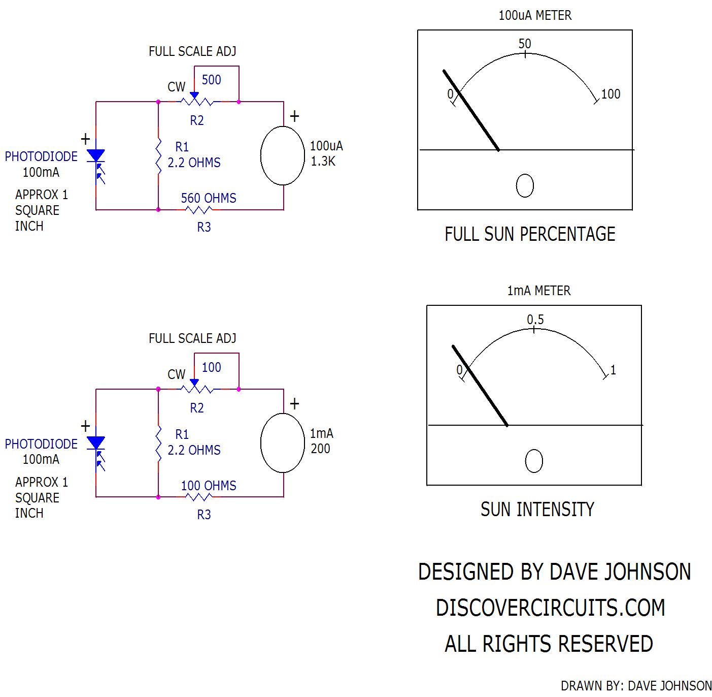 The meter is great for spot checking expected sun power at specific roof angles, times of the day and even overcast conditions. I was amazed when I expected a low power reading on a cloudy day but measured about 60% intensity. I have also shown below the circuit needed for a typical 100uA meter movement. |