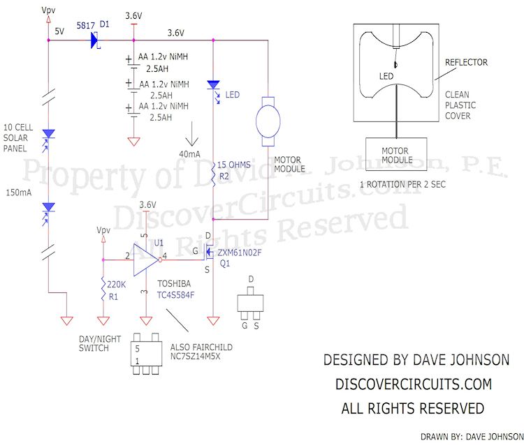 I left the pulse motor alone but added a simple LED driver circuit shown below.  I installed a battery pack made from three 1.2v AA NiMH cells.  A 1N5817 schottky diode between the battery and the solar panel prevented current from leaking back into the solar panel from the battery at night.  I used a single Schmitt trigger inverter to monitor the voltage across the solar panel and switch on an n-channel FET at night to turn on the LED and the reflector motor.  I have a short video of the completed lighthouse in action below.