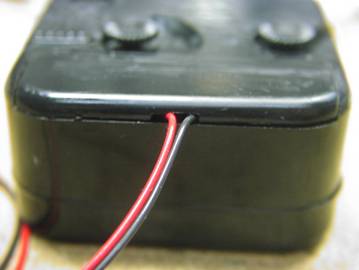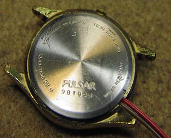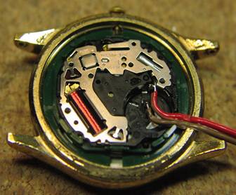Use a thin red wire, about 12 inches long, for the positive side and a darker color, such as black, for the negative terminal. If you have difficulty applying solder the clock’s battery contacts, you can first press some adhesive copper tape onto the contacts, then solder the wires onto the tape. Route the two wires through the notch. Then close up the back plate or compartment. That is it. You are now are ready to time something.