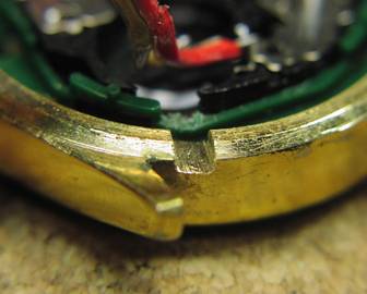 1/16 inch deep notch into the metal of the watch case or the plastic of