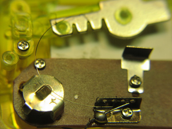 to the battery case and a similar black wire to the pendulum contact metal tab.