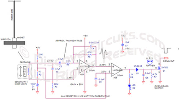 The electronic circuit uses a low power dual op Amp from National Semiconductor.