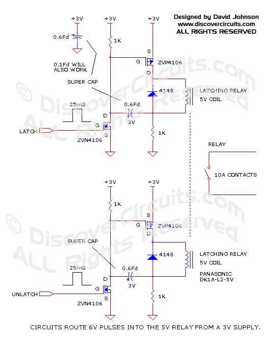 into the separate 5 volt latching and unlatching relay coils. A short 25ms pulse is all