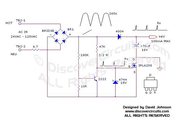 slivers of the rectified AC signal to a 470uF energy storage capacitor. The 180K