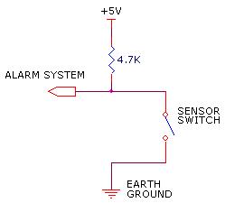 A 4.7K “pull-up” resistor is connected to the alarm’s +5v supply. The remote switches are